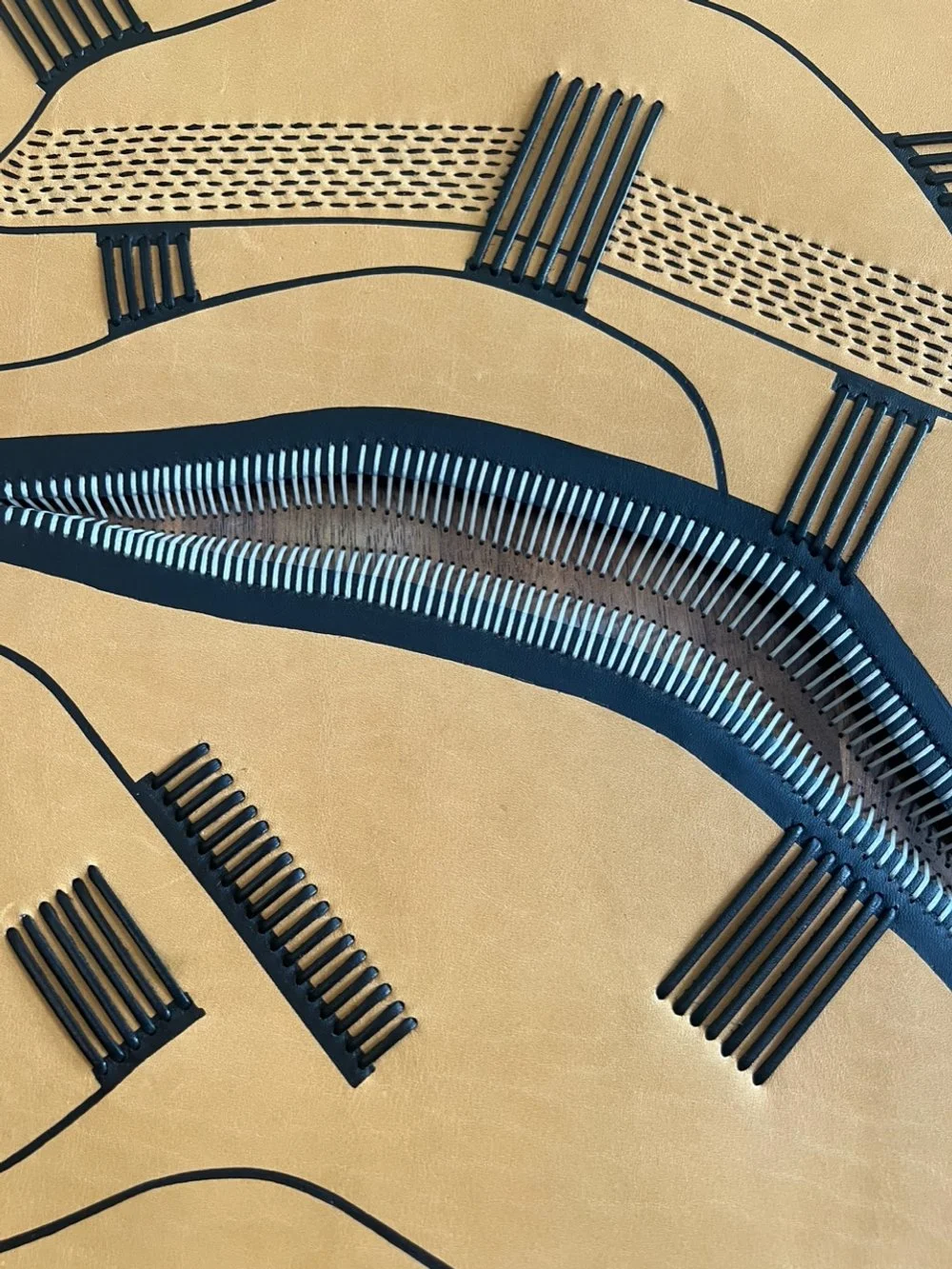Ink/acrylic on leather sewn into walnut veneer via drilled holes. Hand-stitched leather frame